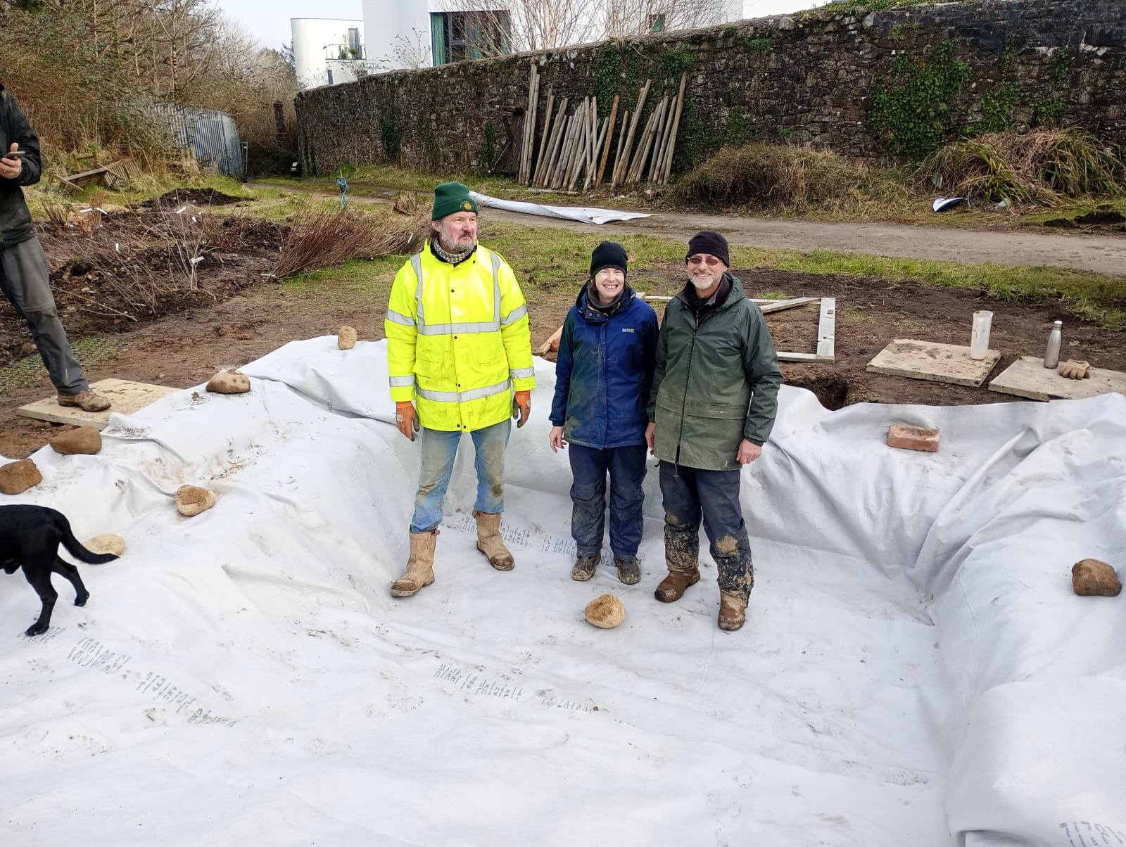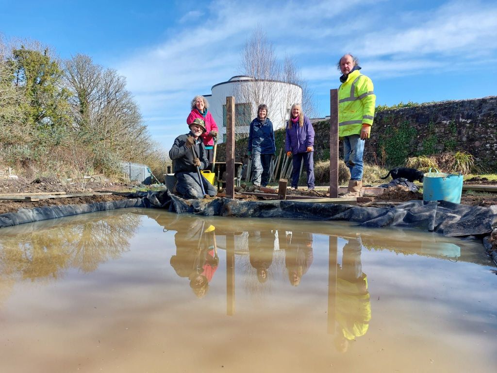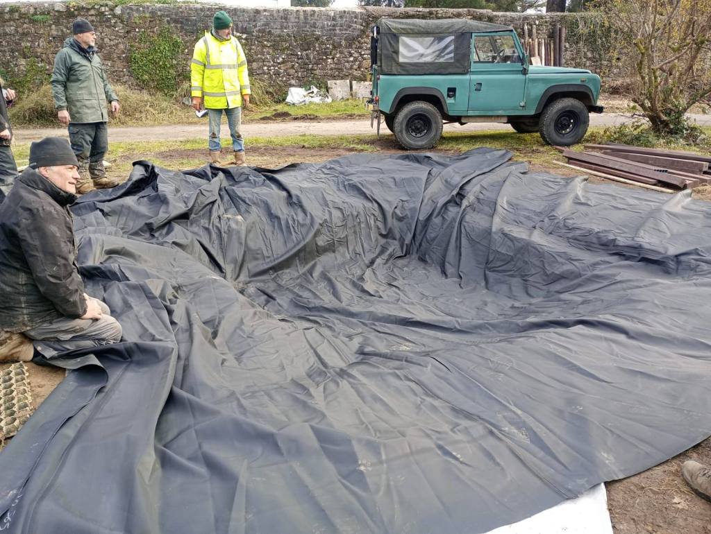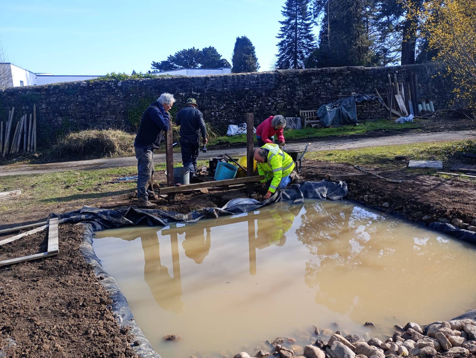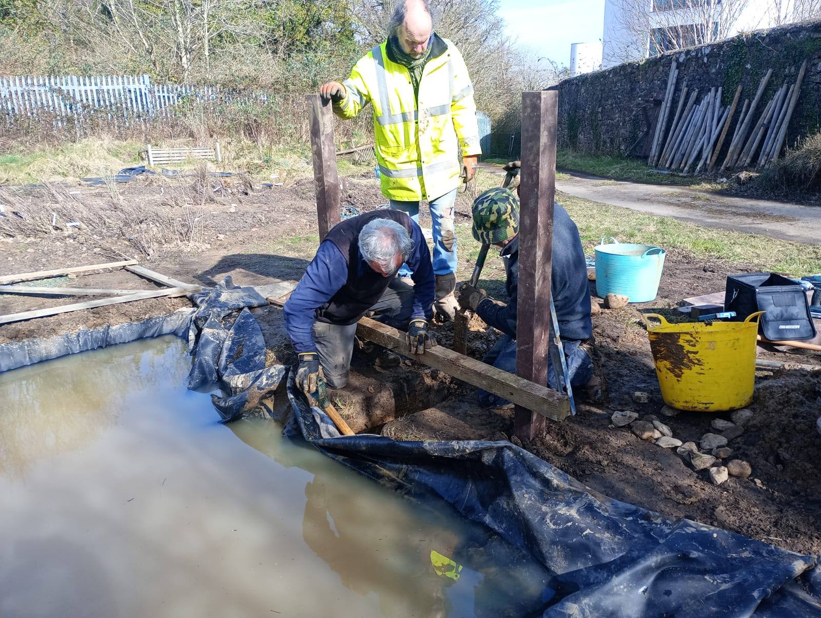 We now have a wonderful new wildlife pond with a dipping platform, ledges of graduated depth and liminal zones to encourage insects, birds and small mammals. The pond was initially dug last summer by a group of marvelous volunteers from the DVSA who worked very hard and made a wonderful start. Our own volunteers then continued the work, digging deeper to create the ledges. Once the preperation work was completed a pond liner was laid and a dipping platform constructed.