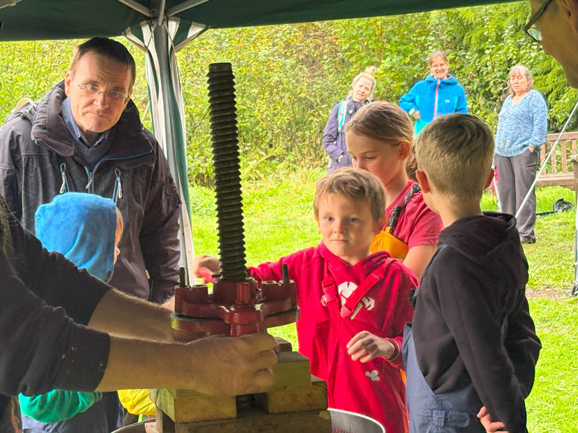 Our wonderful volunteers guided people through each step – from inspecting and washing the apples to make sure they were clean, to feeding them into the scratter, which chops them into pulp ready for pressing. The children were especially enthusiastic about this part, helping to load the scratter and asking plenty of brilliant questions along the way.