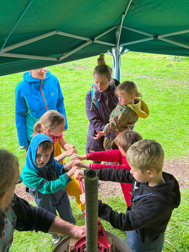 Next came the pressing where apple pulp was packed into the press, and with some teamwork (and lots of muscle power!) the juice began to flow. Having the children join in made the hard work lighter – and more fun.