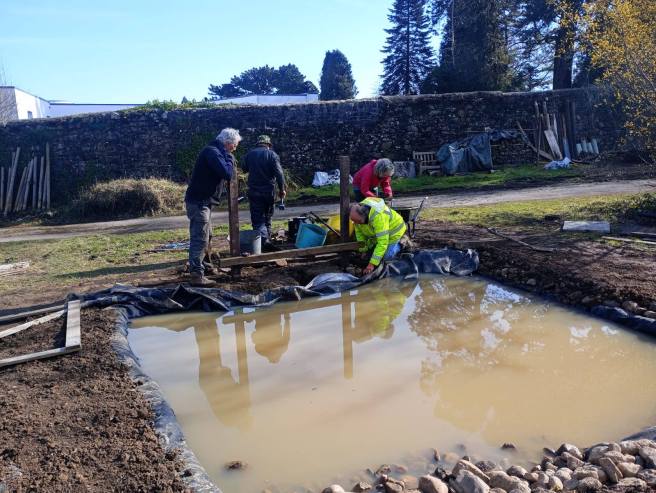 A team of volunteers from the DVSA did a wonderful job of the hard work of digging out the pond. There was a lot of soil to dig and move in order to create the different levels and shelves favoured by the various wildlife we wanted to attract. Our marvellous regular volunteers then finished the excavation, lined the pond and created a dipping platform.This will ensure that we, and any visitors, will be able to use the pond safely for pond dipping with school and youth groups. We’ve already seen evidence of amphibians and insects in the pond, and we’re looking forward to seeing it thrive in the spring.