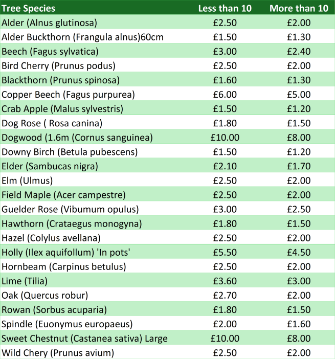 Prices quoted are for bare root whips 40-60cm in hight. Prices may vary for larger sizes. Contact us for discount rates on orders of 50+ of any species.