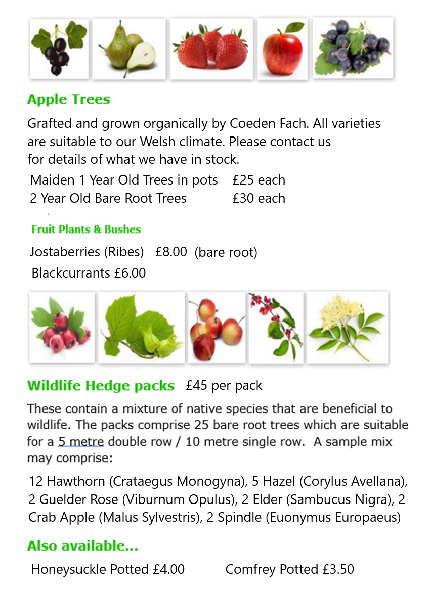 We sell native broadleaf trees during the winter: these are available between November and March and are sold bare-root, and need to be planted immediately. We also have a selection of fruit trees and bushes, native trees and herbs in pots..